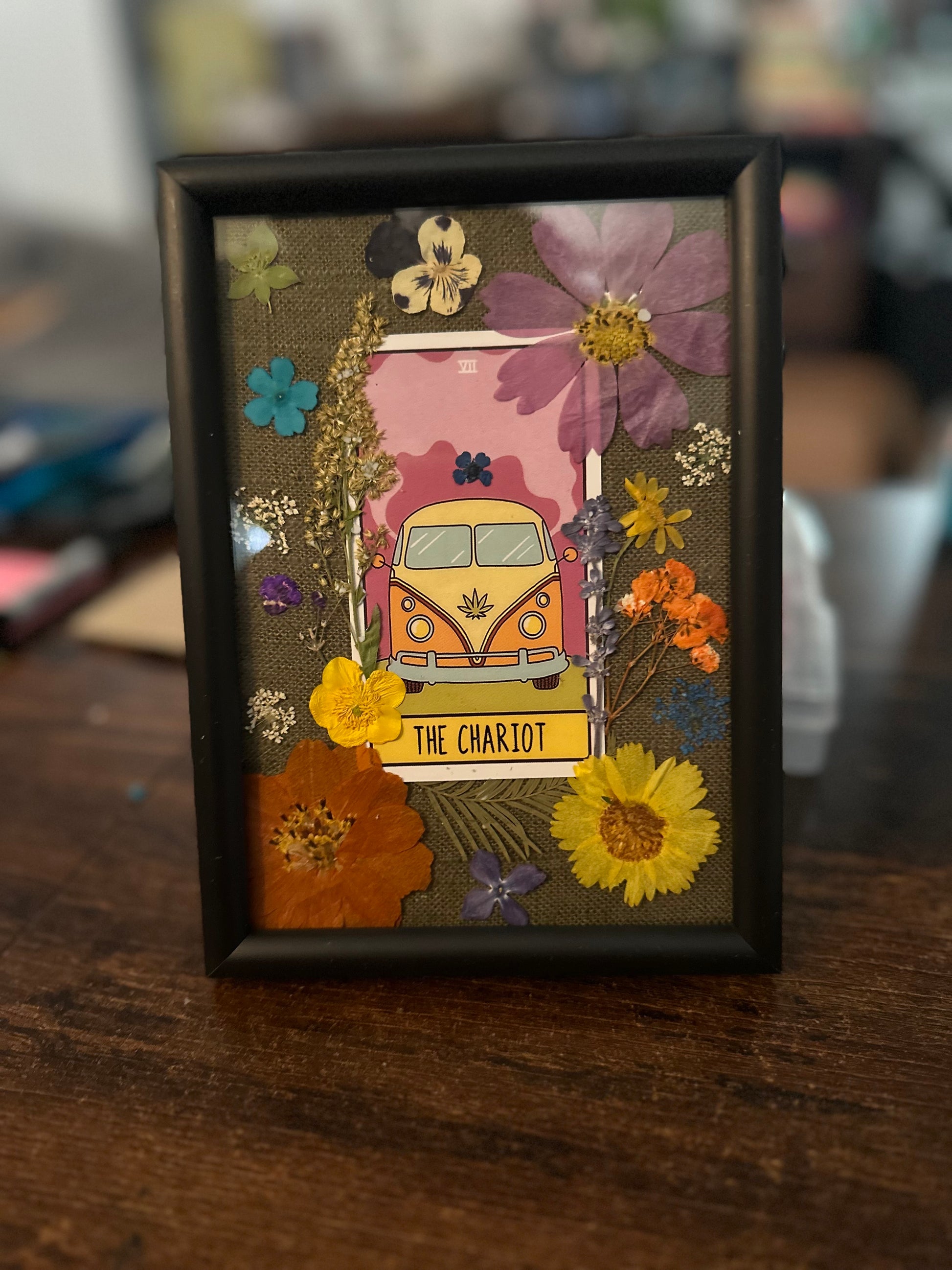 The piece features pressed flowers arranged in the shape of the Cancer constellation around a hazy little VW Bus aka The Chariot Tarot Card. The Chariot card is a symbol of determination, willpower, and victory.