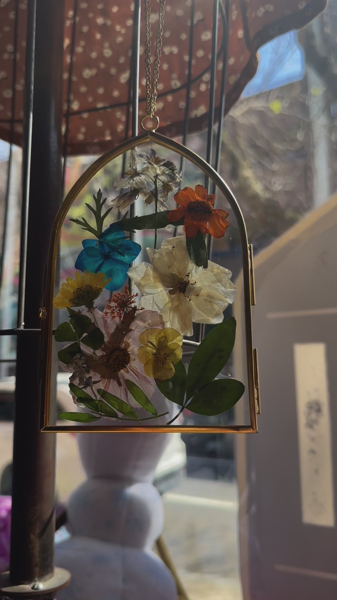 This hanging beautiful gold rimmed glass cathedral window stye frame brings a fun shape to the natural florals inside.