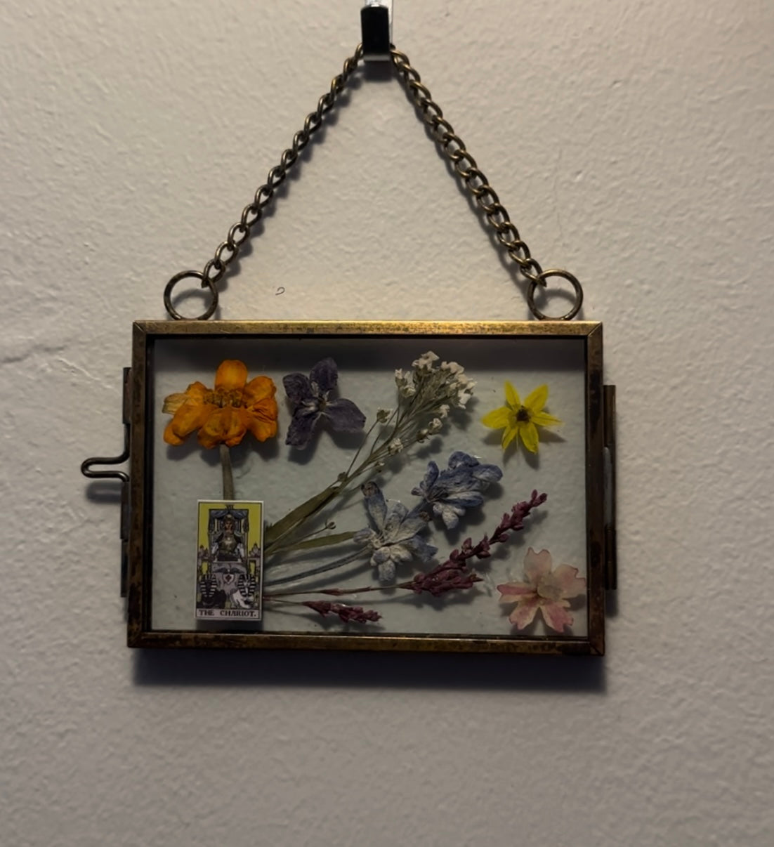 Wide and small hanging glass and brassy gold frame adorned with colorful florals and botanicals collaged inside with a mini Chariot tarot card.