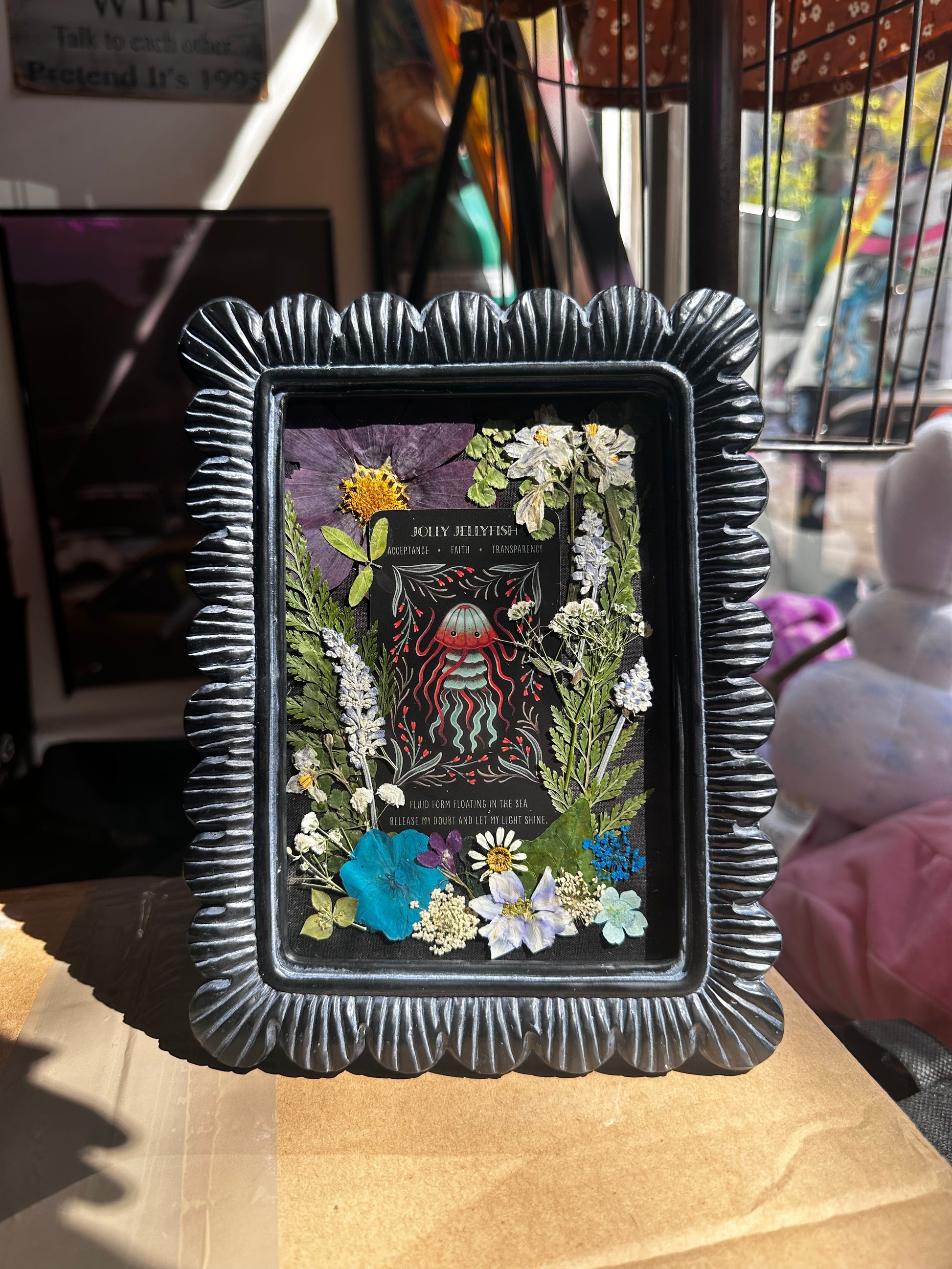 This is in a black textured standing frame with a black/grey cloudy fabric background