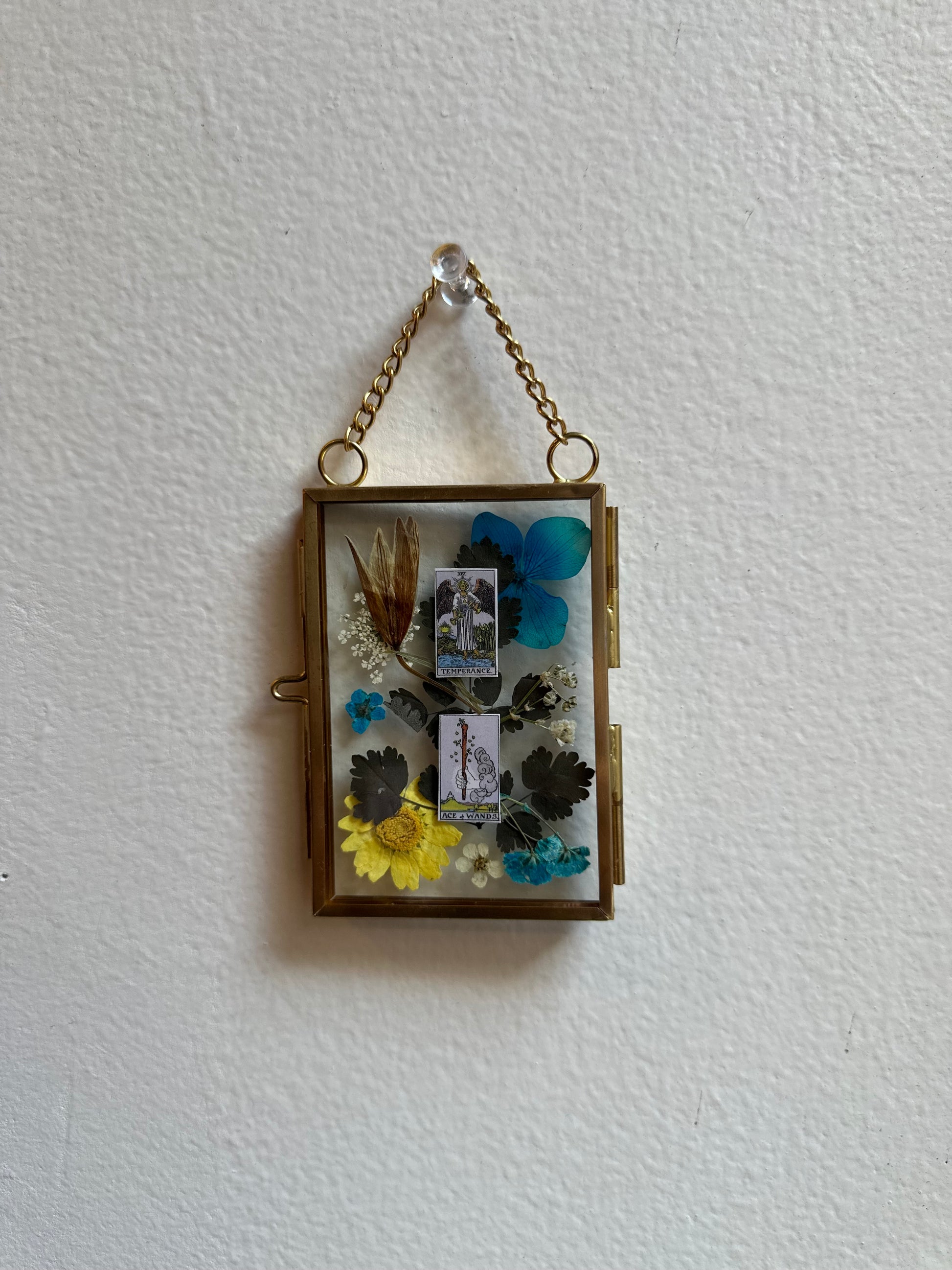 Mini tall rectangle gold frame, with a two tarot card spread adorned with green, blue and yellow florals