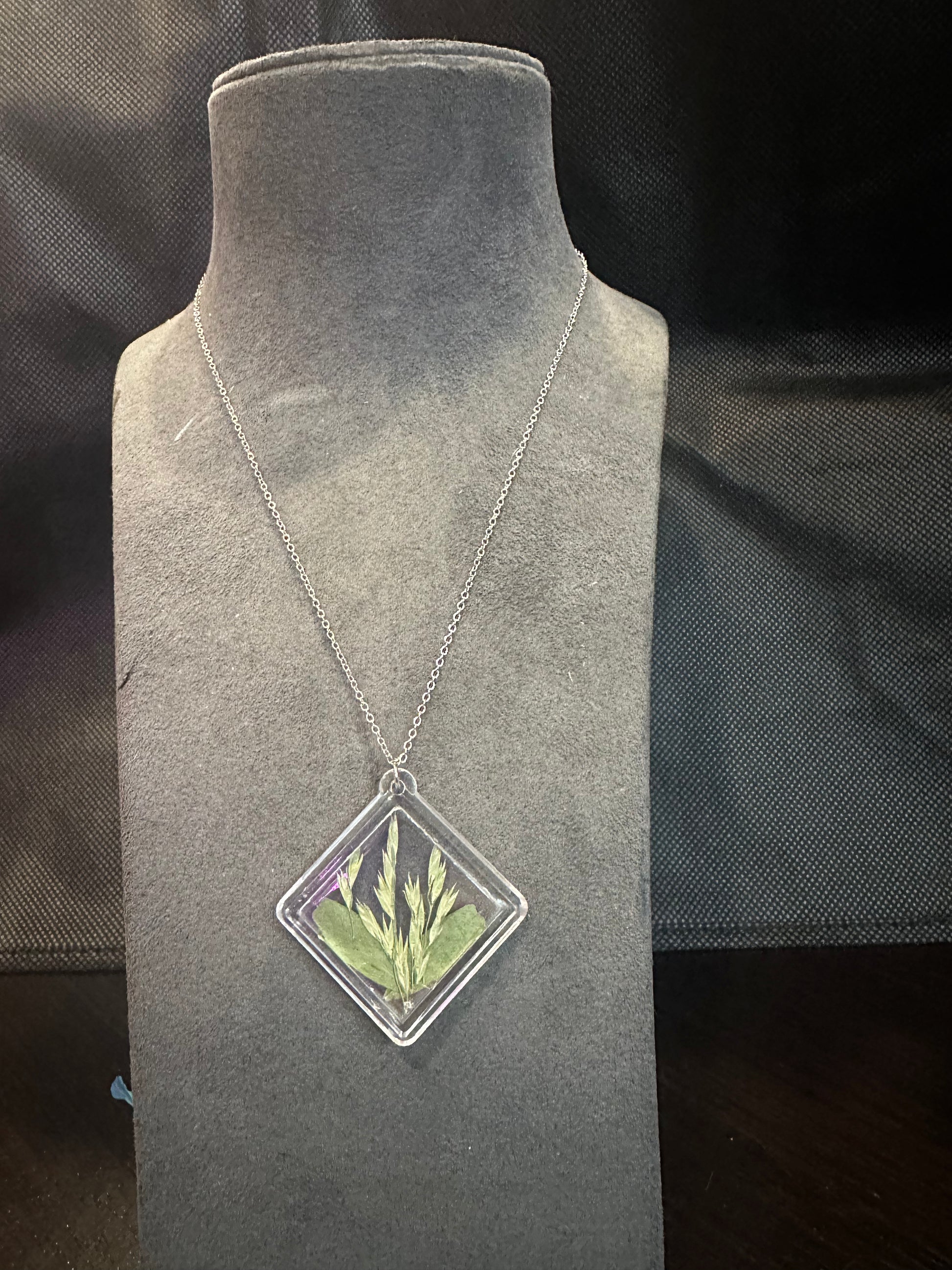 These cutie necklaces have real pressed flowers and other botanicals inside of their square/diamond plastic windows creating little wearable botanical art.
