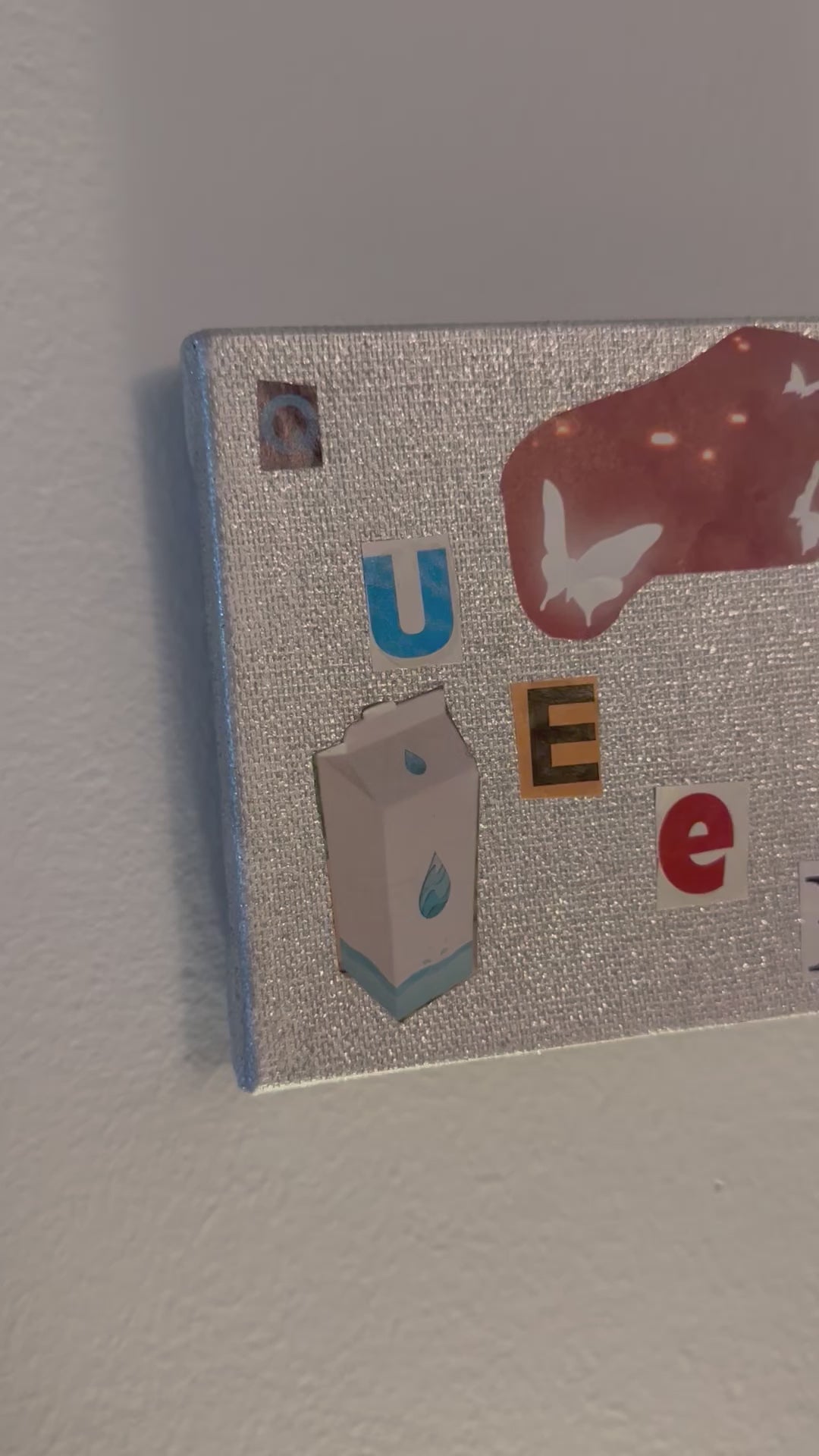 Glitter silver small canvas with collaged “Queer” on it and butterflies and beverages - we know how much queer babes love their little drinks 🥂