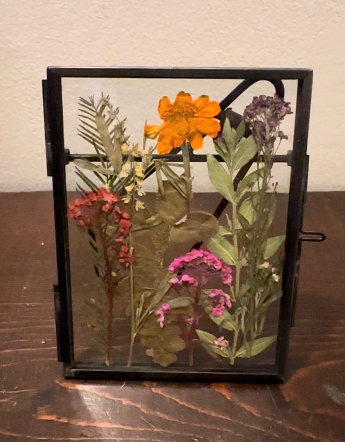 Black rimmed 3 x 5 gold frame adorned with upright green botanicals and pops of colorful florals!