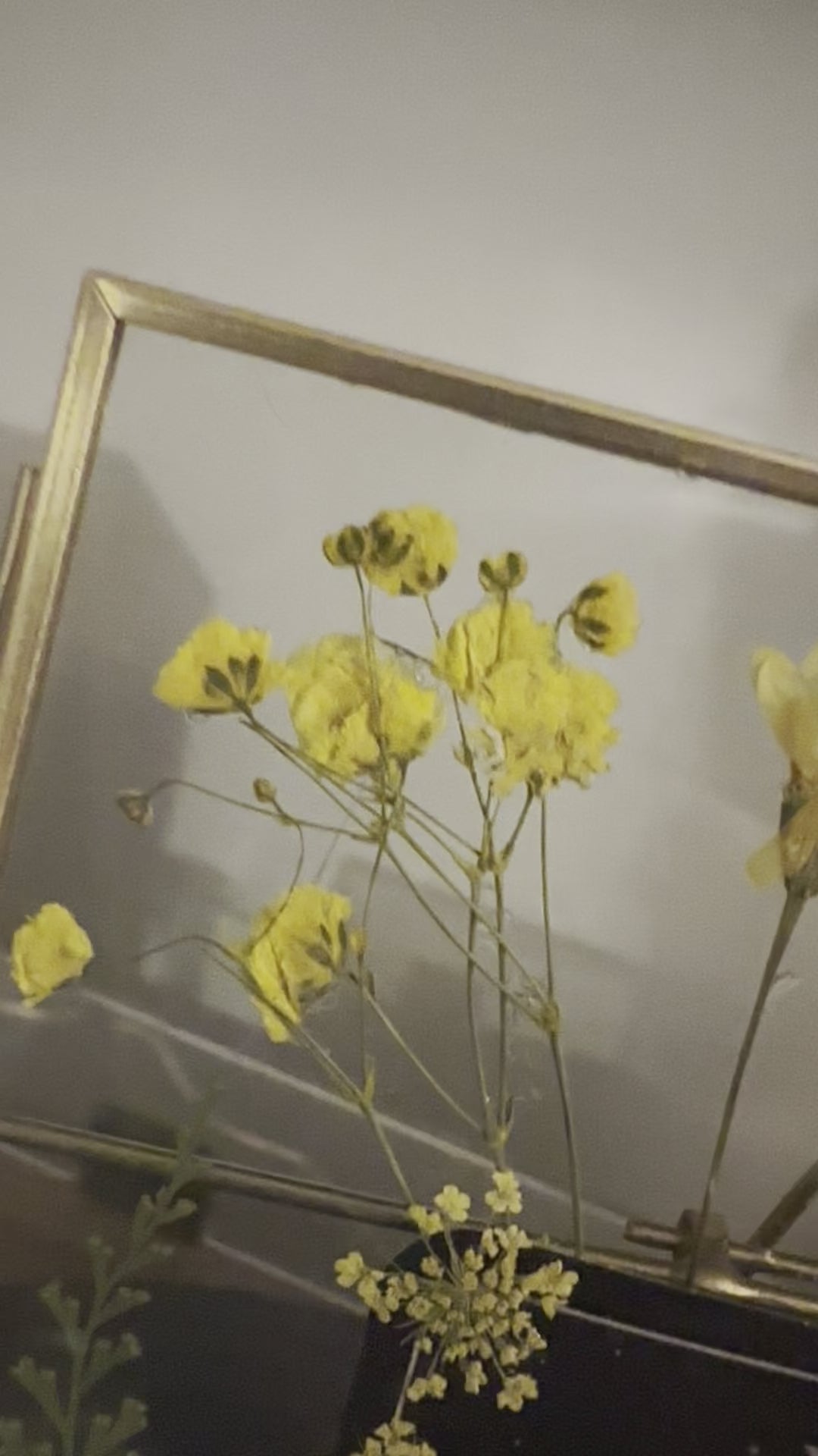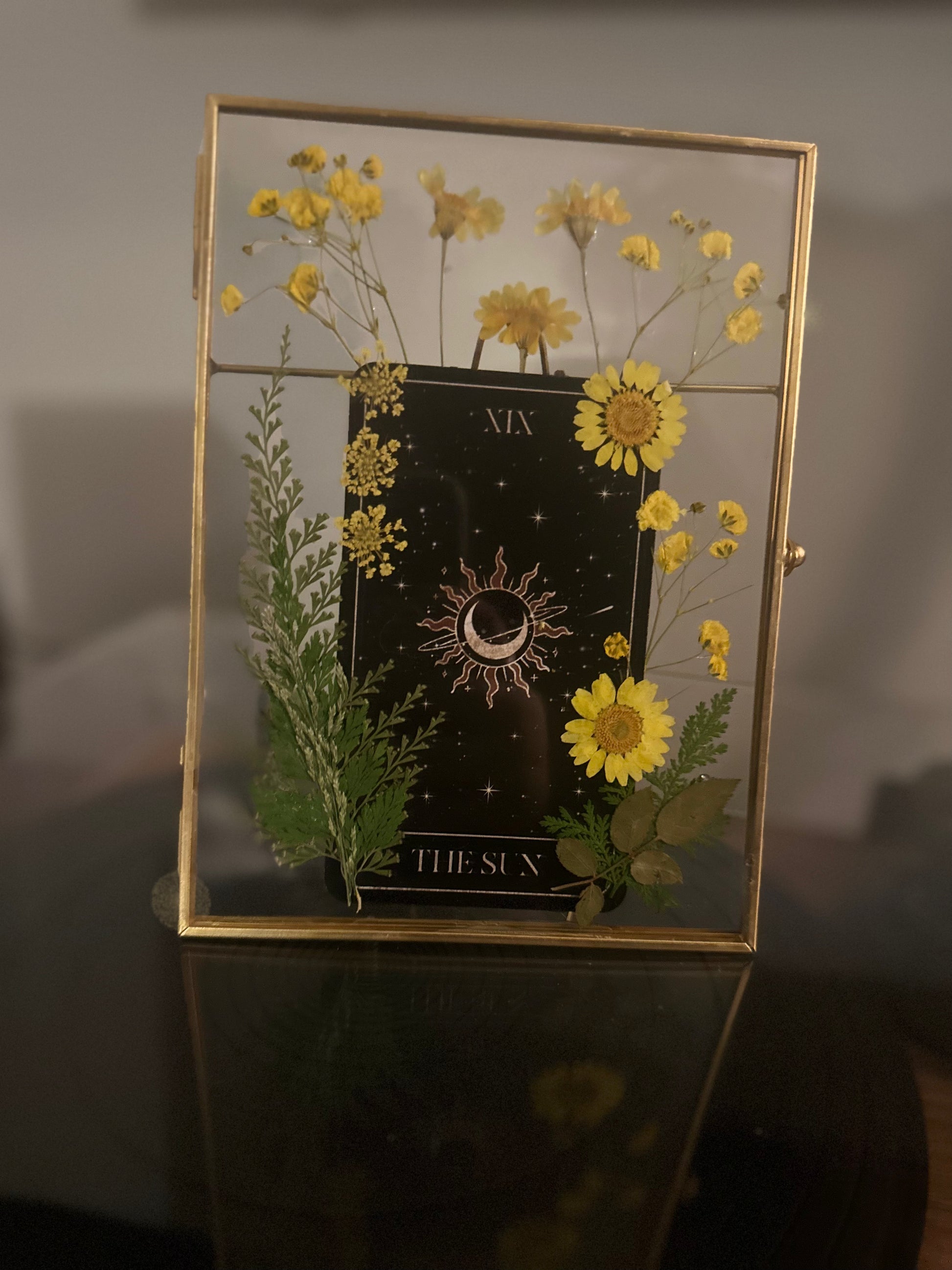 Pressed flower and tarot art in a gold glass frame using the Sun card and the flowers to make the star sign for Leo. Handmade with good intentions and love. ♌️☀️