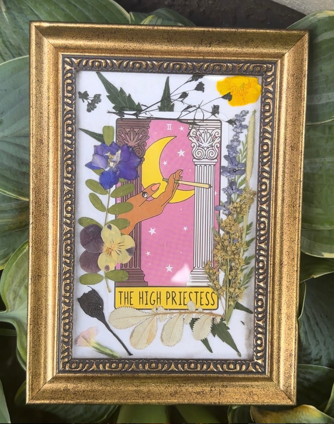 Bronze/Gold frame with a white fabric background and The High Priestess Card adorned with purple, yellow and green florals